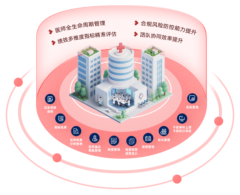 解决医务制度与基础档案管理、绩效与风险监控类管理、协同运营与支持类管理、应急与系统管理。覆盖医师从入职、培训、执业到晋升的全流程,形成完整职业档案。通过资质动态校验、不良事件上报、制度执行监控,降低执业违规风险。基于多维度指标量化医师贡献,为评优、晋升、奖金分配提供数据支撑。集成排班、会议、结果互认等功能,减少行政沟通成本,释放医师临床时间。