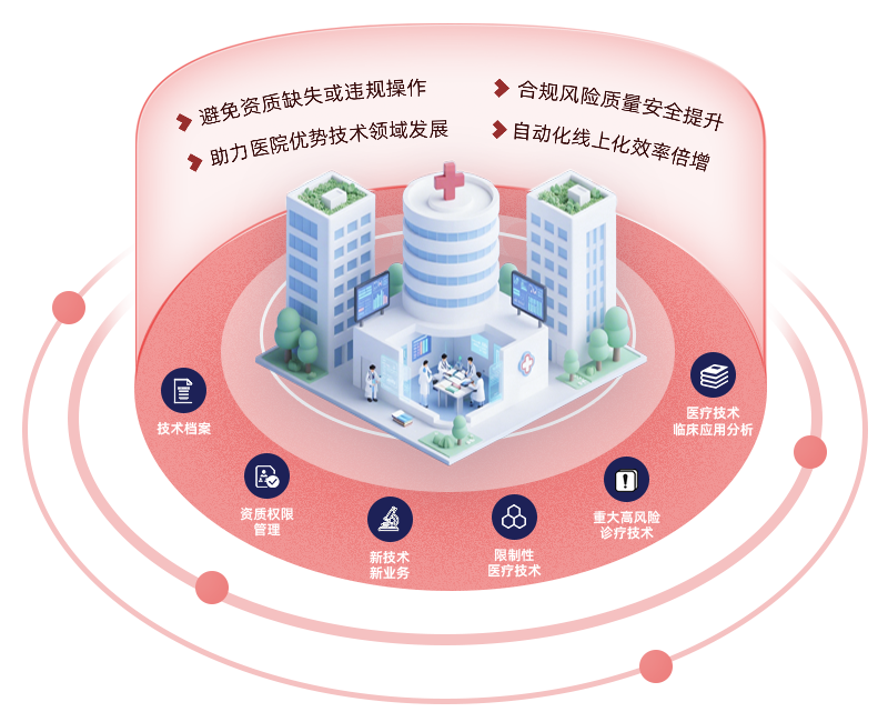 解决医务管理中从技术准入、操作规范到效果评估的闭环管理,同时为医院精细化运营和监管部门政策制定提供数据基础。确保技术应用符合国家《医疗技术临床应用管理办法》。通过全流程监控高风险技术,降低并发症发生率,提升医疗质量。自动化审批、数据整合减少人工管理成本,技术档案与资质的线上化提升工作效率。为新技术引入、科室资源分配提供数据支撑,助力医院优势技术领域的规划与发展。