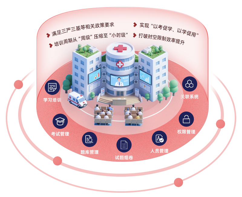 解决医务学习培训管理、考试管理、题库管理、人员权限管理、系统集成与扩展管理。自动生成培训考核档案,便于监管部门检查。通过医学题库动态更新、考核结果分析,精准定位培训薄弱环节。医师线上化培训,打破时间、空间限制。智能组卷、自动评分、自动分析、减少人工工作量。