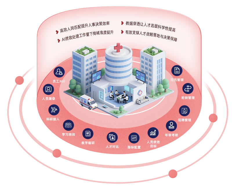 实现全院职工360°画像与人岗匹配的秒级运算,招聘、调配决策周期由平均7天压缩至2小时。系统内置的 AI绩效引擎自动抓取业务数据、生成个人目标并实时预警偏差,使年度考核工作量下降 60%,绩效面谈精准度提升45%。通过人员对比与招聘评价模块的数据穿透,干部遴选与外部引进的客观量化指标占比由40% 提升至92%,有效支撑医院“十四五”、“十五五”人才战略落地。